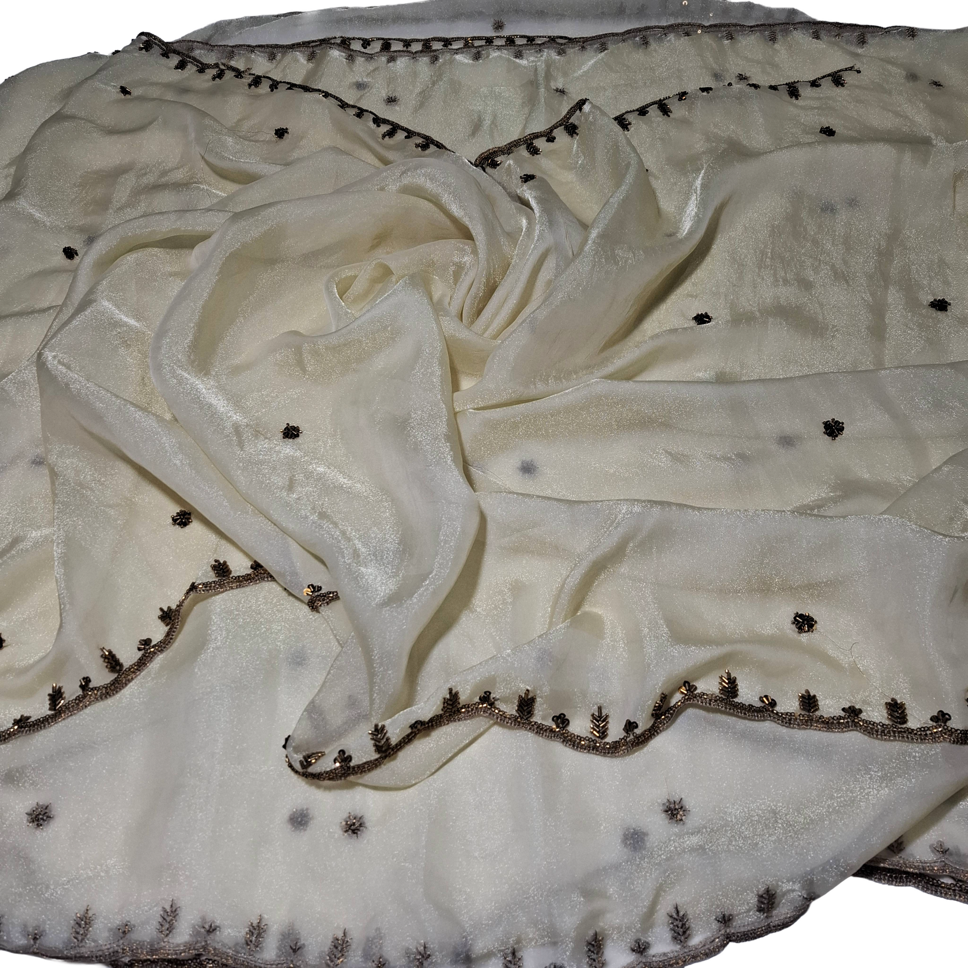 This cream fabric is perfect for making a beautiful dupatta. It has a soft shine with small floral buttas all over. Both sides have a border that gives a complete and elegant finish. The fabric is lightweight, easy to drape, and ideal for partywear and festive outfits.