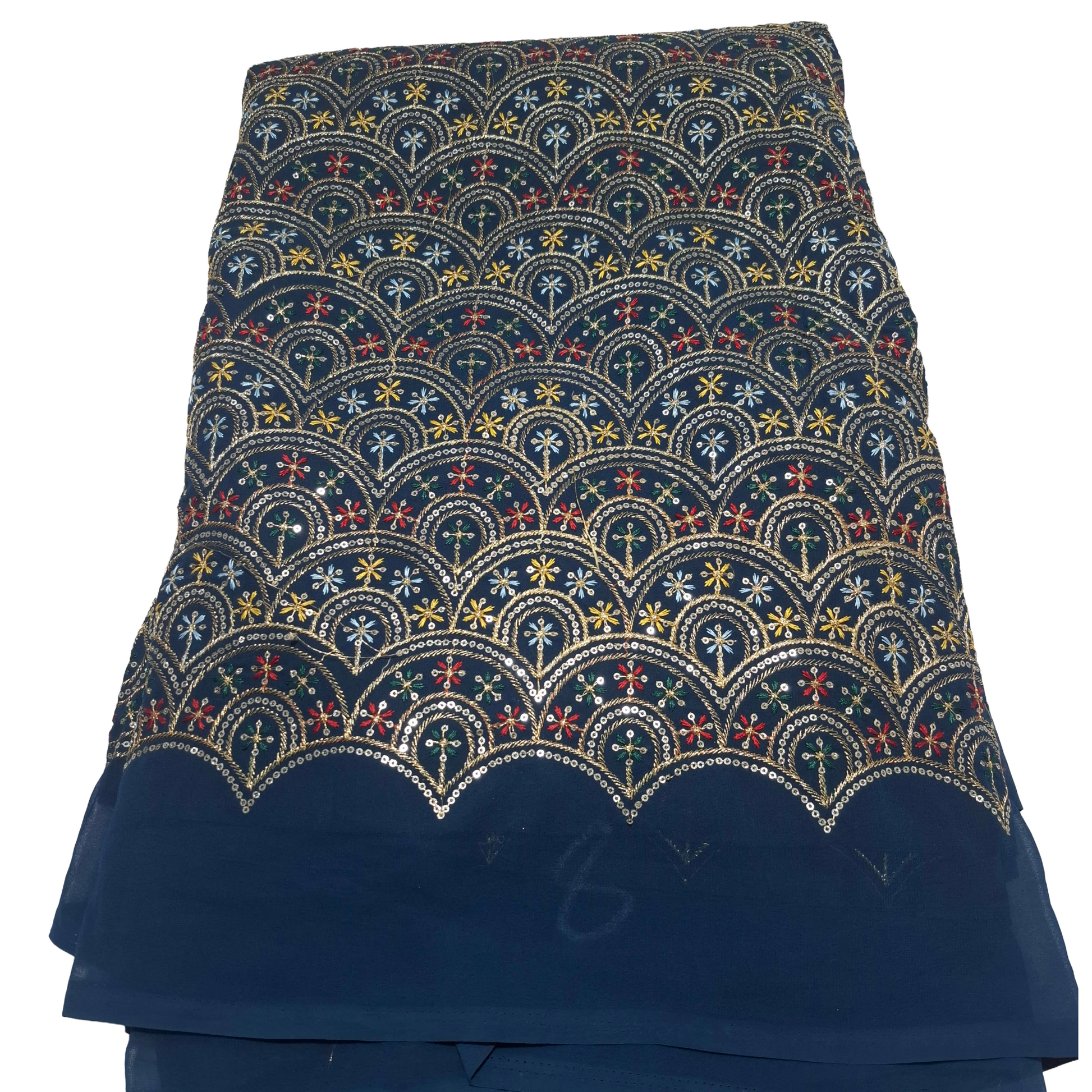 Premium teal blue georgette fabric with beautiful multicolour embroidery and sequence work. Soft, lightweight, and perfect for suits, Kurtis, gowns, and festive outfits.