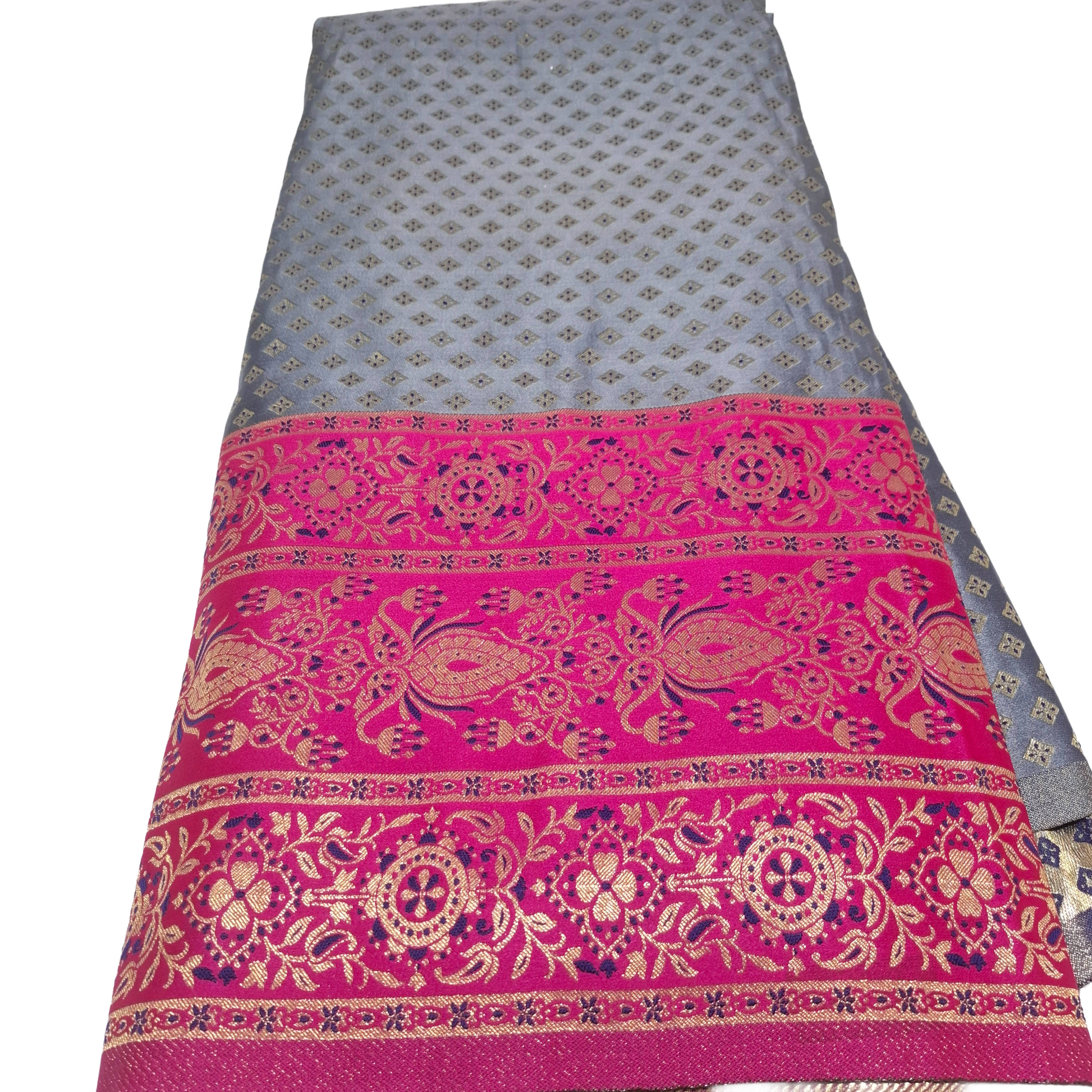 Grey Banarasi Fabric with Pink Border | Premium Banarasi Silk
