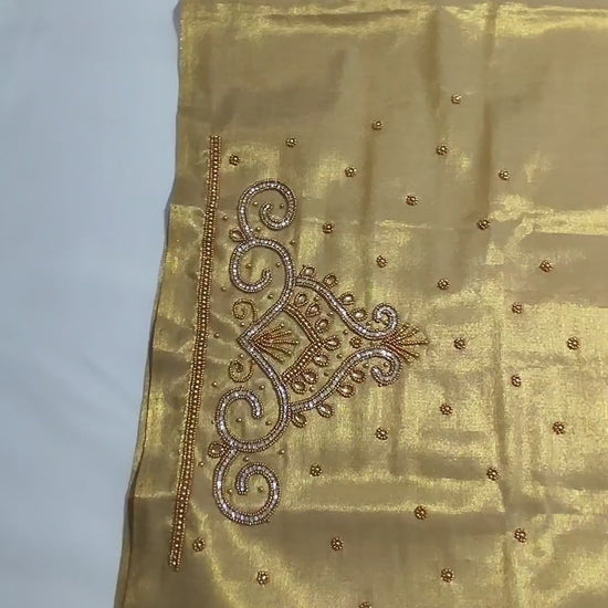 Beautiful light gold blouse piece with premium hand work and stone work detailing. The intricate design features golden beads, pearls, and stones that give a rich and elegant look.
