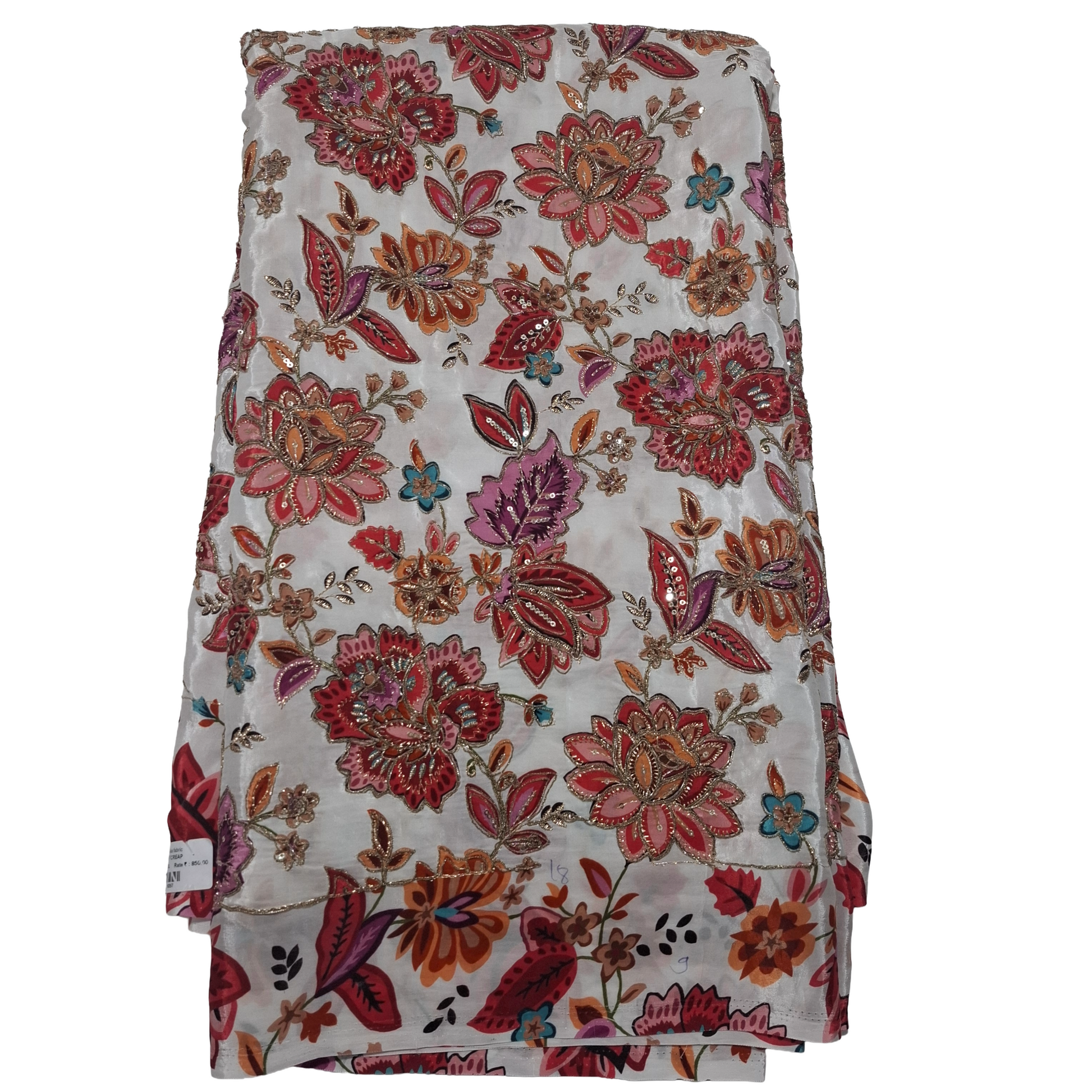 Pure Natural Crepe Fabric – White Base with Multicolor Floral Embroidery & Sequence Work