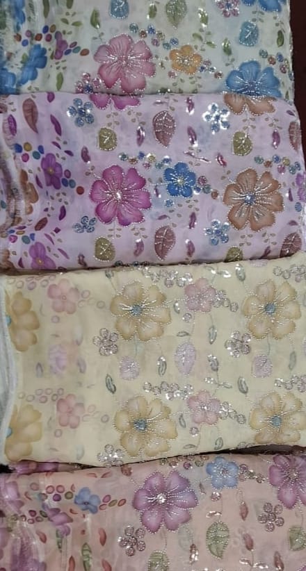 a premium floral embroidered fabric featuring soft pastel tones and elegant sequin detailing. Perfect for lehengas, sarees, gowns, and festive wear, it combines luxury and comfort with a subtle shimmer that elevates any outfit.